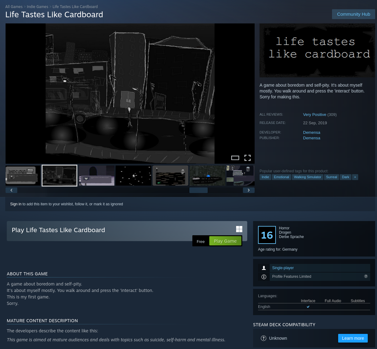 The description "I'm sorry for making this" as well as the combination of "deals with topics such as suicide, self-harm and mental illness" with "It's about myself mostly" did peak my interest though. And given that it's free, I added it to my account.