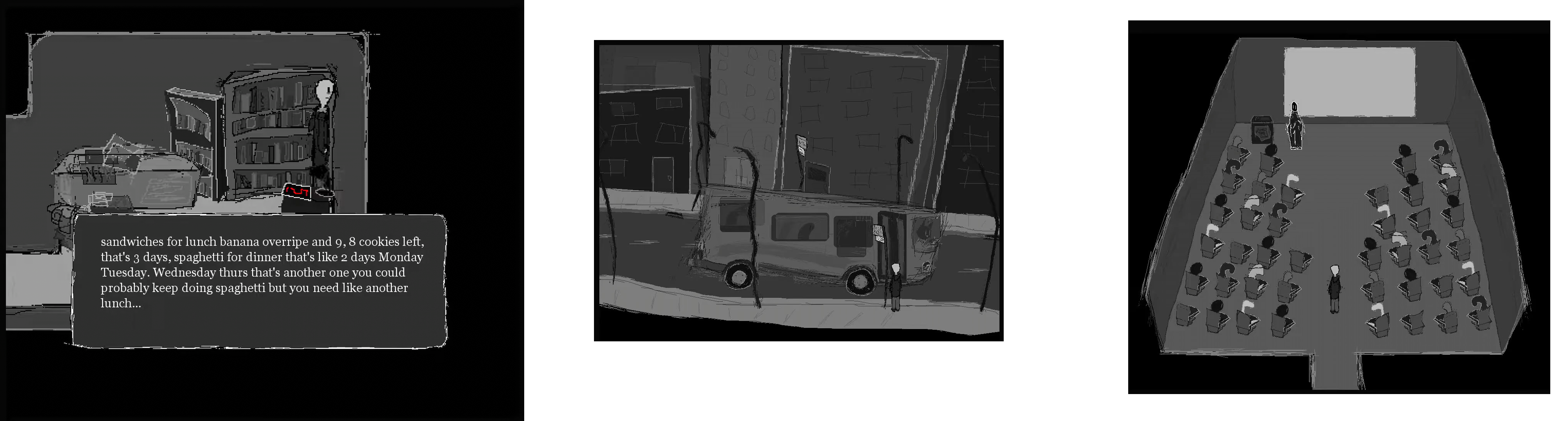 Let me show you some parts of the beginning of the game. You wake up, and you can scroll through two small screens of Jon's apartment. The "dialogue" at this point consists of Jon's thoughts. You leave your apartment, take the bus to the university, sit down for the lecture without being able to interact with anyone. Then you take another bus home. And the cycle repeats the next day. So far, it's very easy to believe that this is Jon's life, and by extension, the life of the developer.